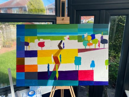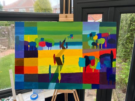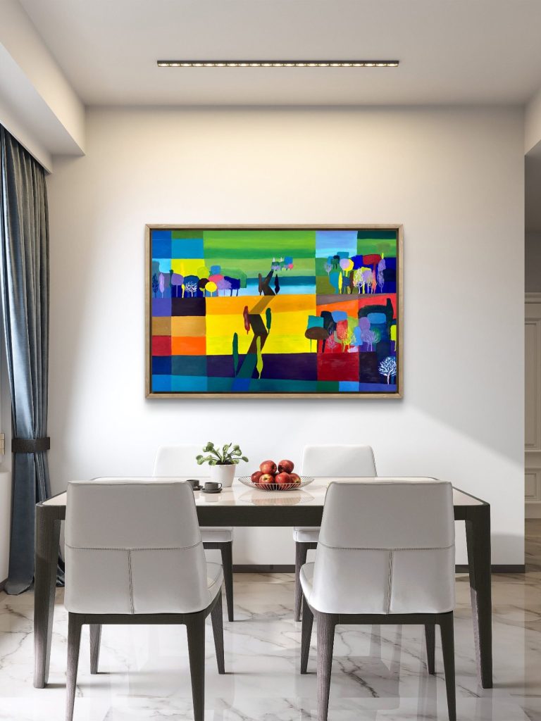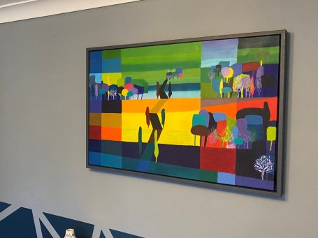 This striking piece explores the intersection of nature and geometry, reimagining the countryside as a vibrant, structured tapestry. Using a "blocked" landscape technique, the composition breaks the natural world into rhythmic squares and rectangles of colour, creating a sense of balance and modern sophistication.