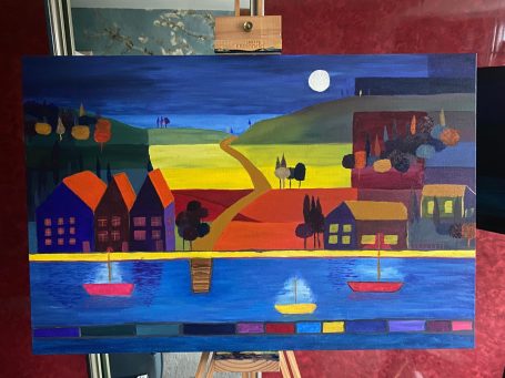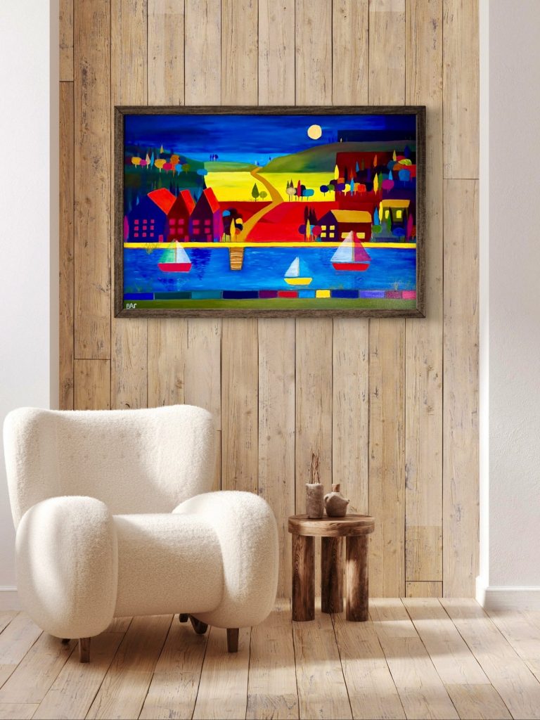 In this piece, the natural world is reimagined through a structured, rhythmic lens. A winding golden road draws the eye deep into the heart of the countryside, past clusters of colourful, geometric houses and towards the soft glow of a full moon. Below the hills, a tranquil harbour comes to life, with sailing boats reflecting their light onto the deep blue water, creating a bridge between the land and the sea.