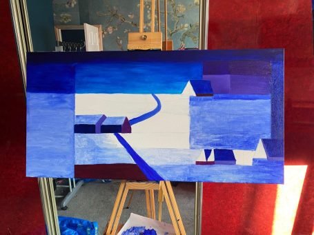 The piece is anchored by a characteristic windy road that snakes through the heart of the valley, leading the viewer past charming farmhouses and clusters of rhythmic, geometric trees. It is a celebration of time passing and the feeling of a warm late summer’s afternoon