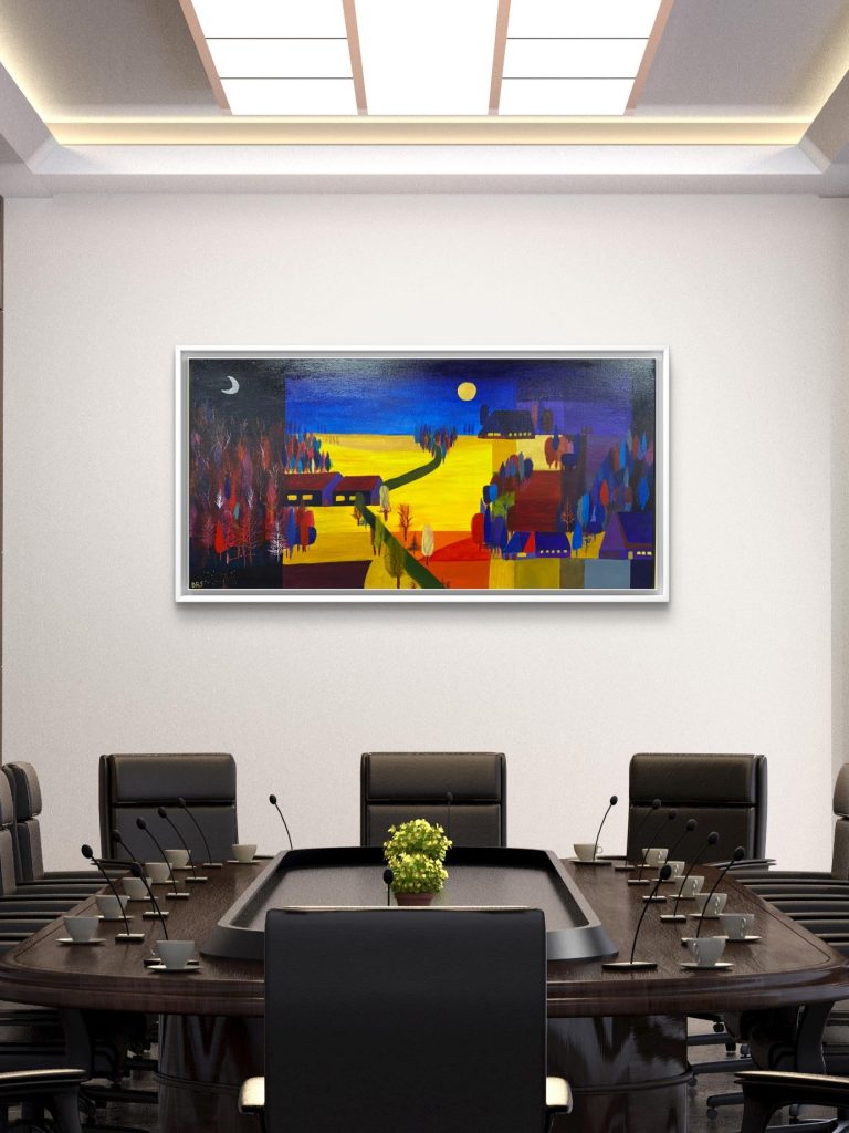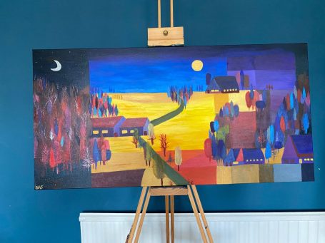 Inspired by the rolling landscapes and sturdy farmhouses of the British countryside. On the left, a dense, moody forest is bathed in the cool glow of a crescent moon, while the centre and right of the canvas burst into the vibrant, golden energy of a high-noon sun.