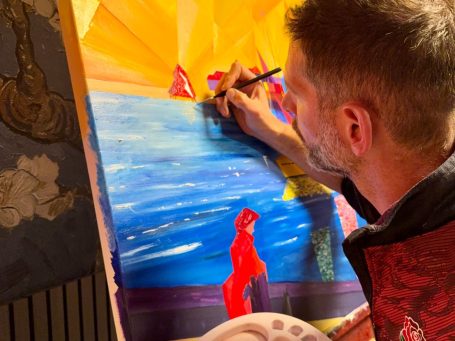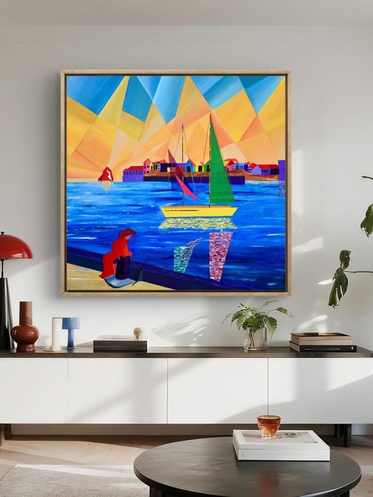 This piece was based on a photograph of the North Shields Fish Quay. This iconic harbour reimagined here in vivid colours. Painted over the course of several months in the summer of 2025. Although a bright and bold painting full of motion and reflection, the cloaked red figure offers a moment of calm and serenity to the piece.