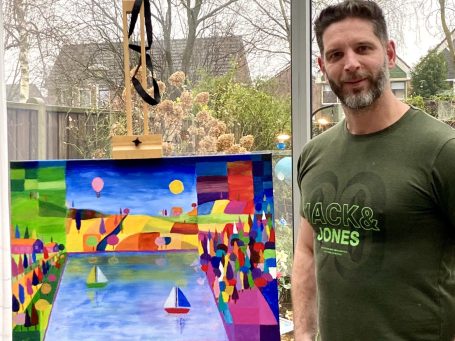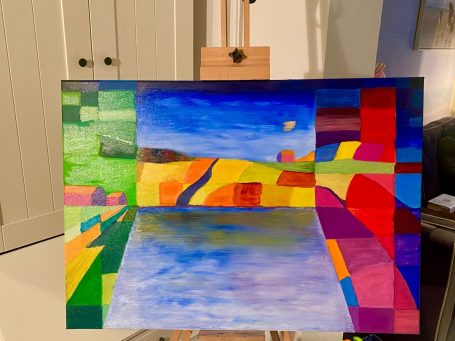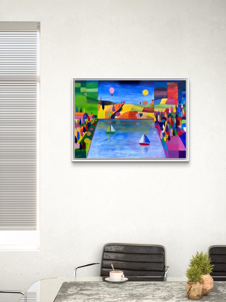 The composition draws on my Dutch heritage, featuring the end of a traditional canal—a sight so familiar in the Netherlands. This is reimagined within a colourful, blocked landscape teeming with life, from sturdy ships on the water to a hot air balloon drifting through a faceted sky. It is a compact celebration of colour, geometry, and the local landscape.