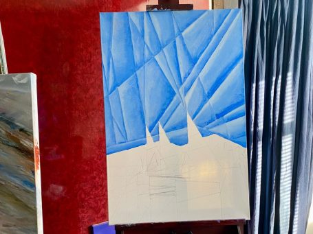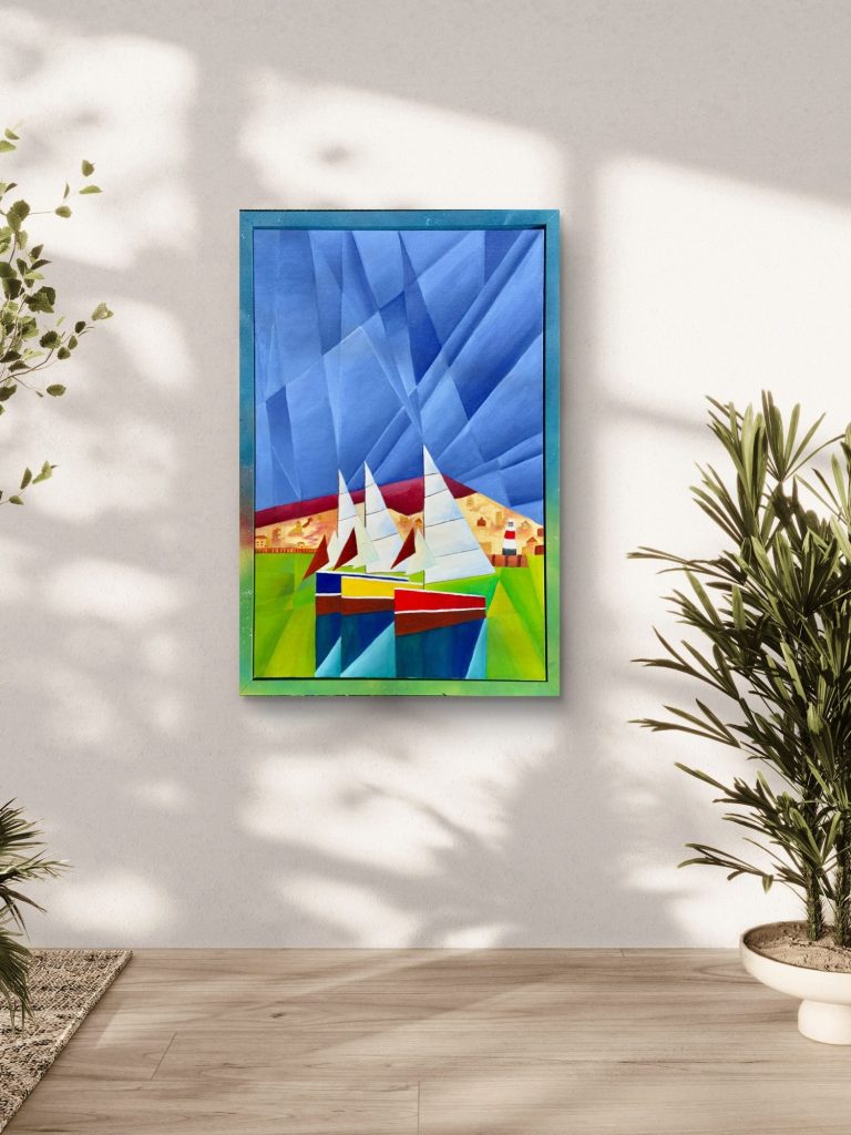 This work represents my first exploration into a fractal sky, a technique I developed to capture the rhythmic, crystalline nature of light over the water. The sharp, angular facets of the sky provide a high-energy backdrop for the bold, primary-coloured sailboats and the steady presence of the harbour lighthouse.