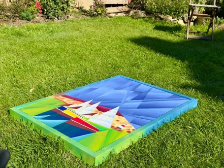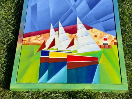 To create a truly immersive experience, I hand-painted the frame to mirror the internal gradients of the painting. The deep, grassy greens at the base transition into the celestial blues at the top, allowing the energy of the harbour to extend beyond the canvas and into your living space. This piece remains a milestone in my portfolio, marking the moment I began to play with light in a more architectural, faceted way.