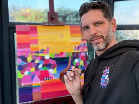 From the clustered, colourful treetops to the winding path that leads the eye toward the distant architecture inspired by water towers near my paren't place in the Netherlands. Every inch of the canvas is filled with motion and optimism.