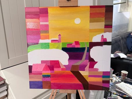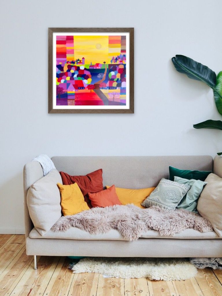 The composition is dominated by the brilliant yellows, deep pinks, and rich purples typical of a high-summer sunset. These hues breathe warmth into the stylised trees and patchwork fields.